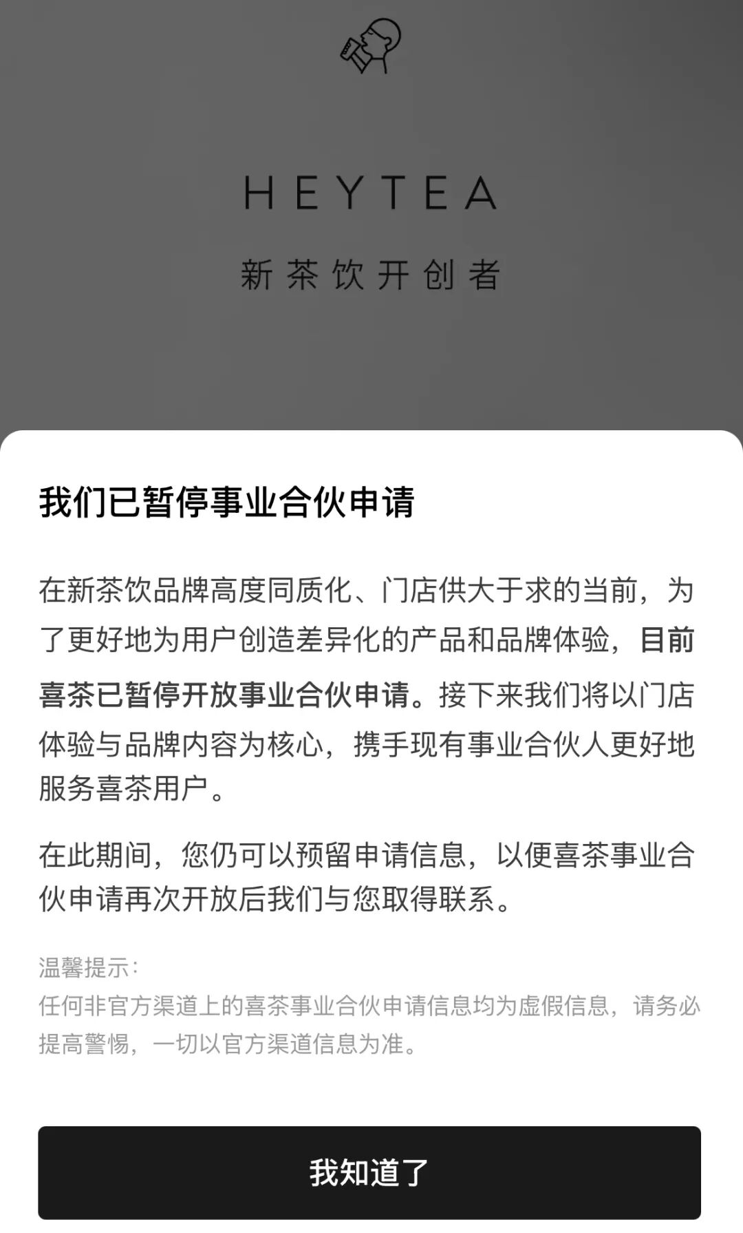 2025 年 2 月 10 日,喜茶发布《不参与数字游戏与规模内卷》内部信,表示将暂停加盟业务。